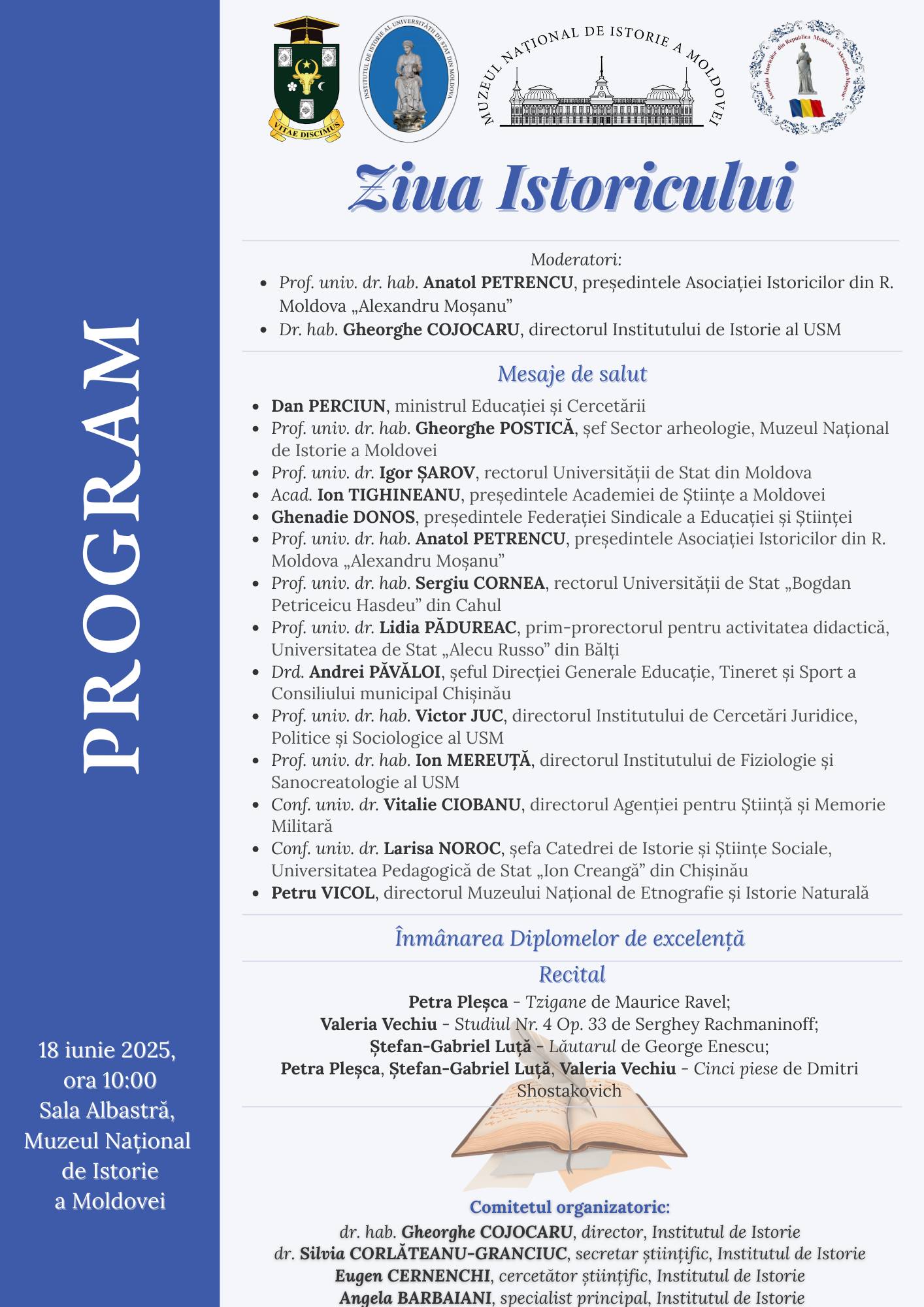 Institutul de Istorie al USM, în parteneriat cu Asociația Istoricilor din R. Moldova „Alexandru Moșanu” și Muzeul Național de Istorie a Moldovei, organizează ședința festivă consacrată sărbătorii profesionale „Ziua Istoricului”.